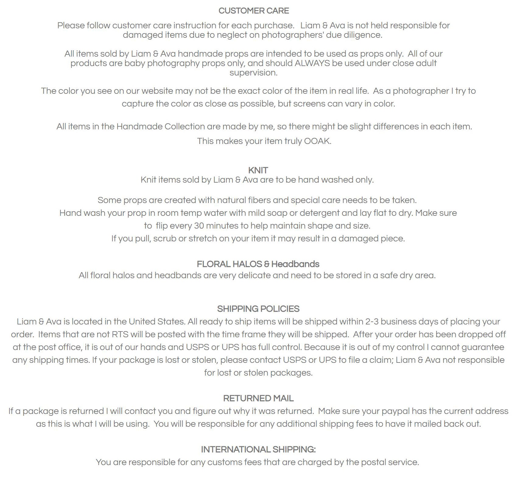 - Liam & Ava Handmade props is not responsible for lost or stolen packages.